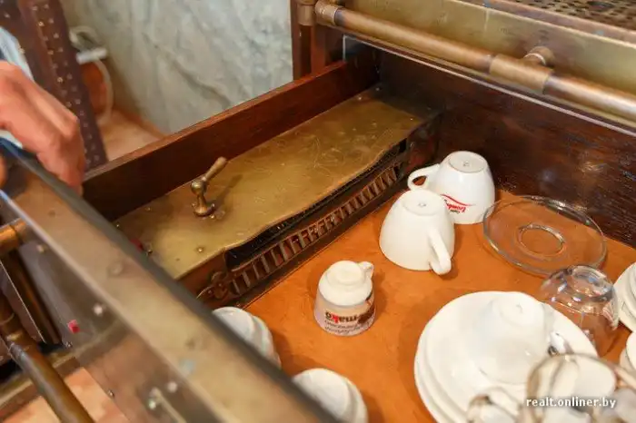 Сверху располагаются емкости для напитков. Снизу несколько полок, каждая из которых несет свою определенную функцию. На первой лежит медный поднос, на второй хранится посуда, причем эта посуда подогревается специальным устройством.