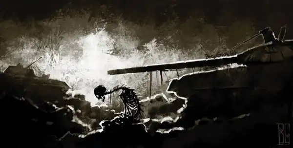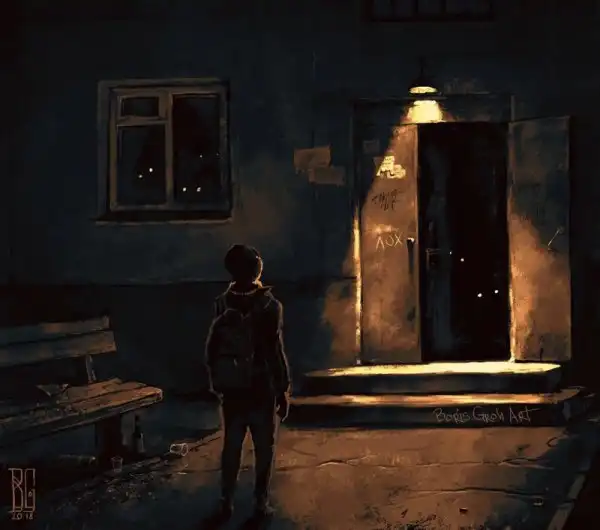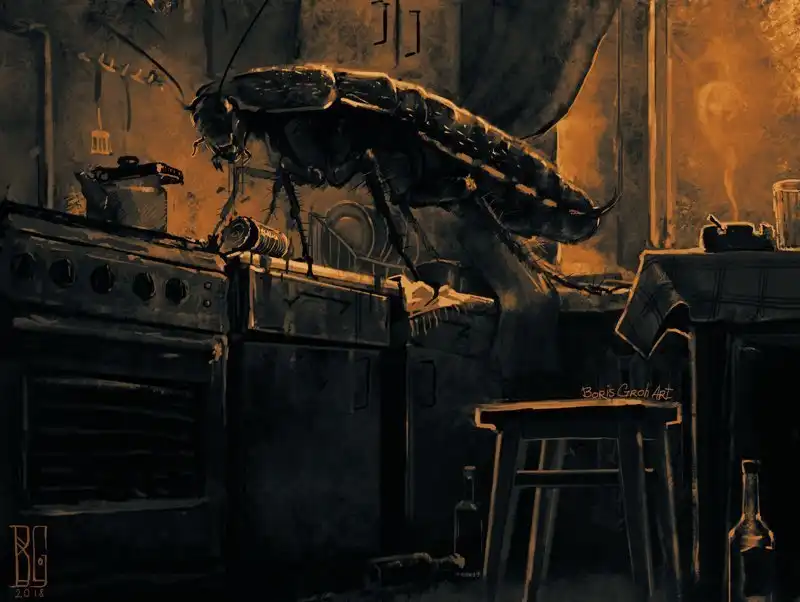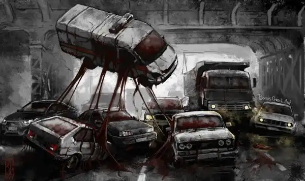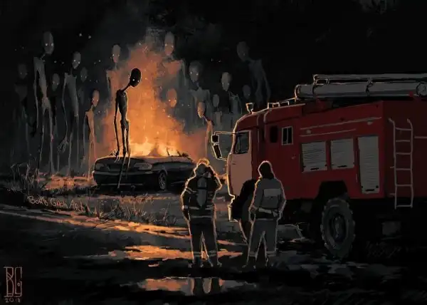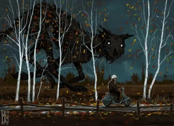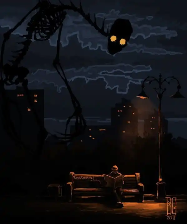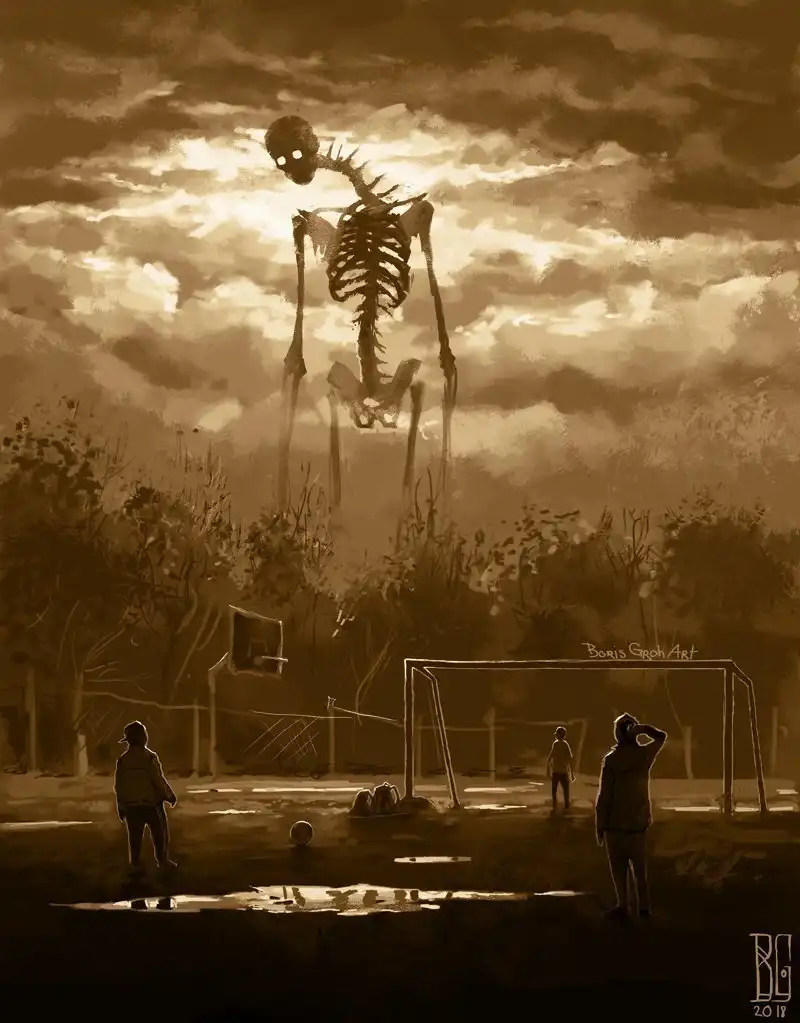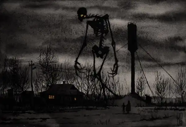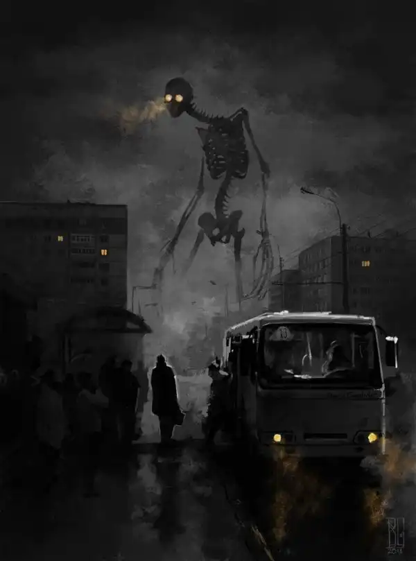 Автор этир работ — замечательный молодой художник Борис Грох. Во многих его картинах гигантские скелеты и другие мрачные твари оказываются словно запертыми в сером и обыденном окружении городов и жизненной рутины. Оказывается, им тоже не чужды грусть, одиночество и любопытство.