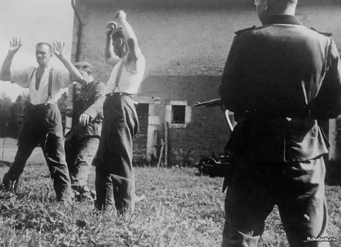 Арестованные по подозрению в дезертирстве солдаты немецкой армии в тылу Западного фронта. 1944 год.