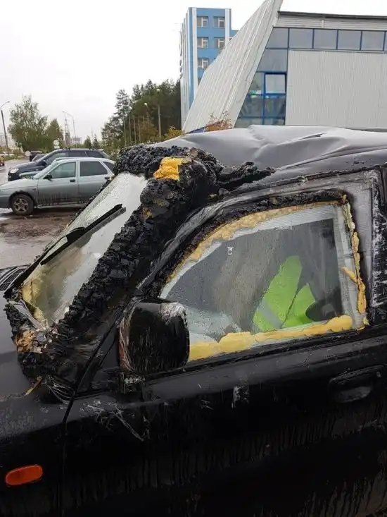 Фотографии из этого поста в очередной раз доказывают, что абсолютно всё в этом мире можно "починить" при помощи скотча и монтажной пены. Хоть в данном случае владельцу этого авто еще и понадобился баллончик с черной краской, чтобы придать элемент "завершенности" ремонту, это не меняет сути. Главное, что это не влияет на скорость езды, так что - и так пока сойдет.