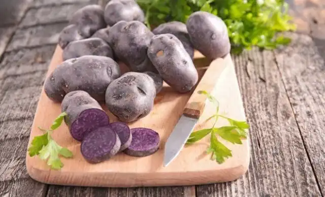 На самом деле, это фиолетовый картофель, мякоть которого выглядит так, будто внутри целая Вселенная. Цветная окраска вовсе не является достижением генной инженерии, а является естественным пигментом, полученным при скрещивании различных диких видов. Подобные виды картофеля могут иметь мякоть фиолетового, синего или даже красного цвета.