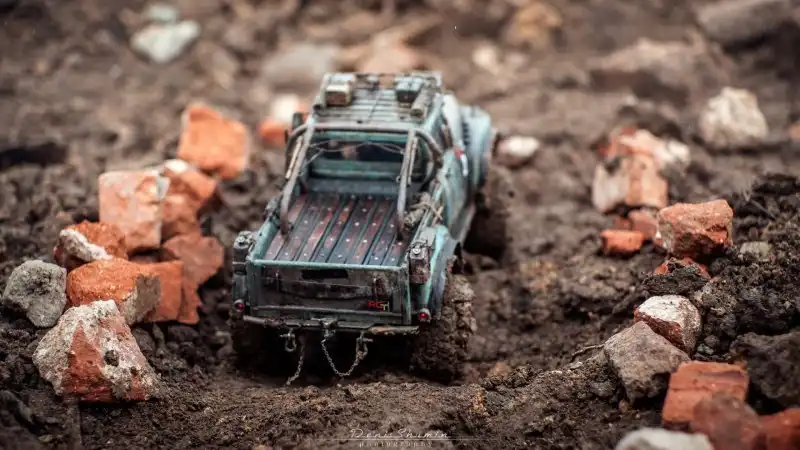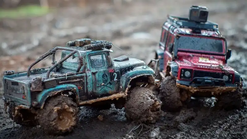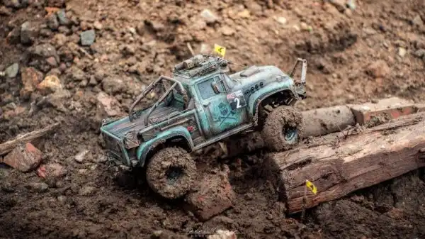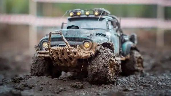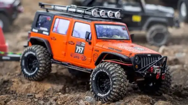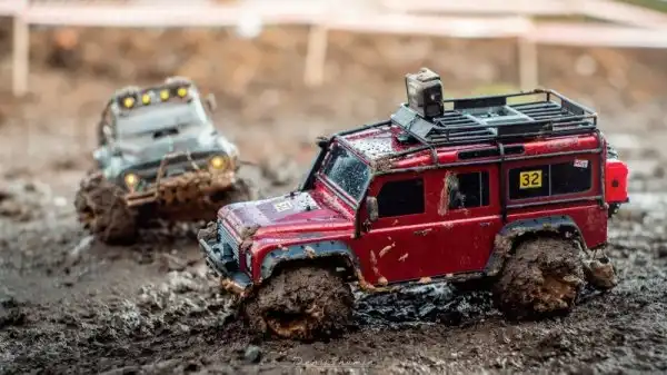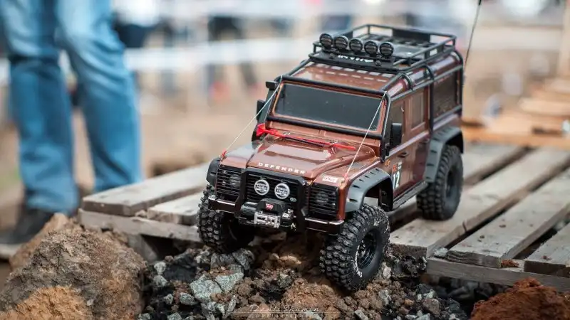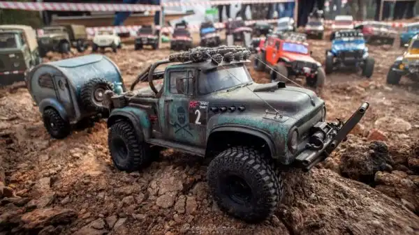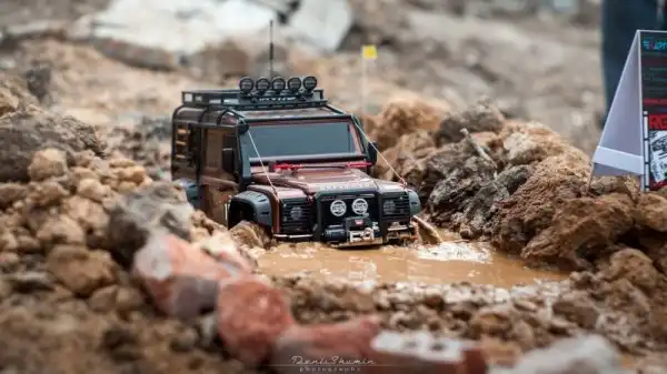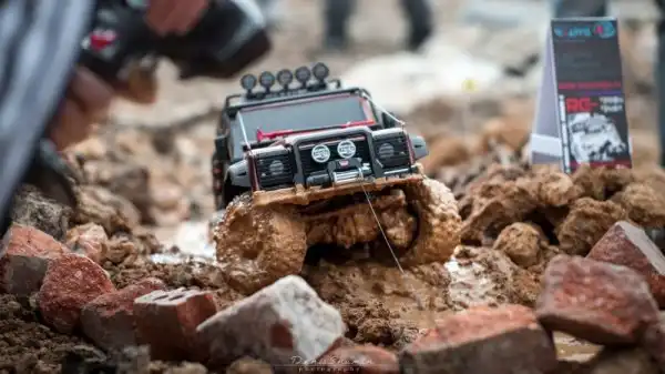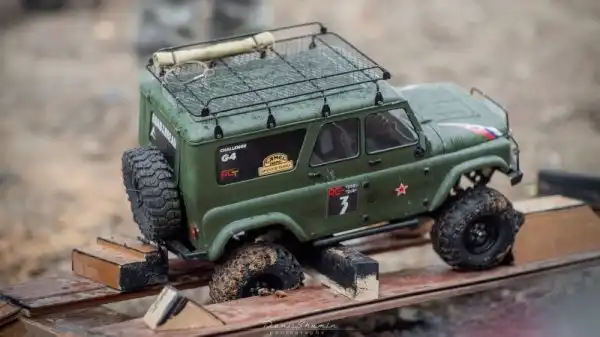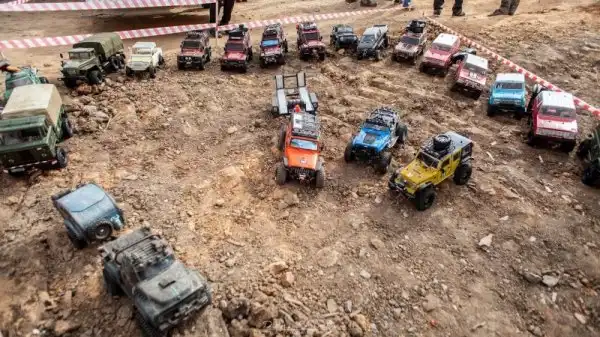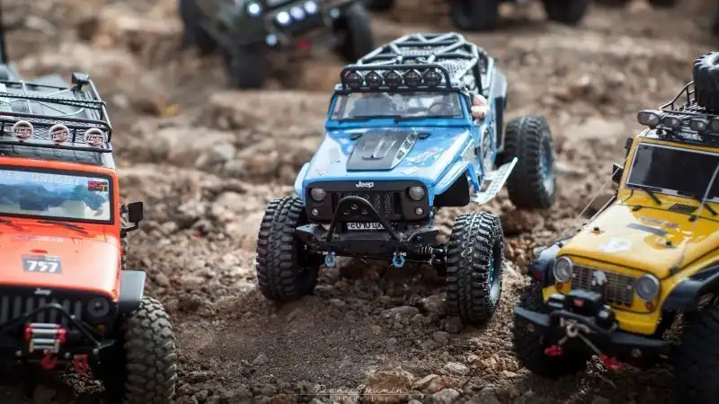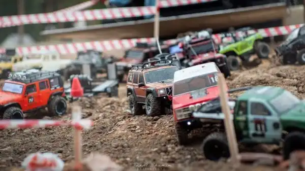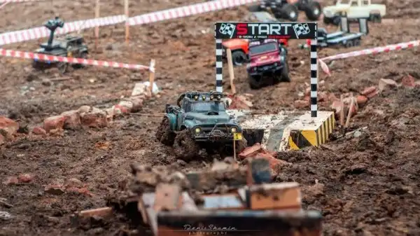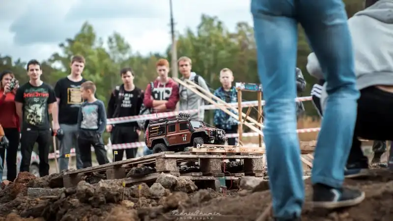 Bнтересные соревнования радиоуправляемых автомобилей. Масштаб каждой равен 1/10, у многих установлены рабочие лебедки, блокировки дифференциалов, понижающей передачи, свет фар, имитация рабочего двигателя и прочие копийные детали.