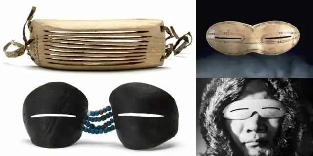 Подобные очки использовались и, в принципе, используются и по сей день эскимосами для предотвращения снежной слепоты. Они изготавливались из моржовой кости и часто выполнялись с изгибами под лицо конкретного пользователя. Две длинные прорези, ремешок из сухожилий и солнечные очки готовы!
