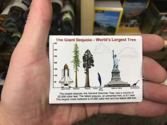 Интересное сравнение размеров можно увидеть на сувенирной продукции, которую продают в местном визитор центре. Вот, например, магнитик с соотношением секвой и знакомых всем достопримечательностей: