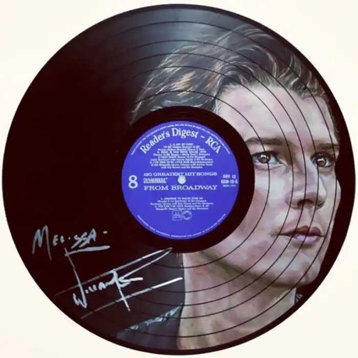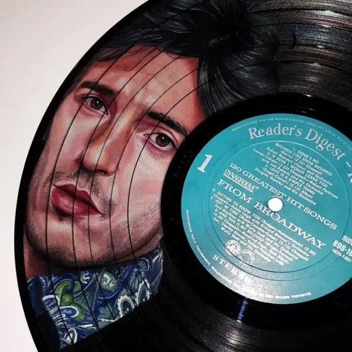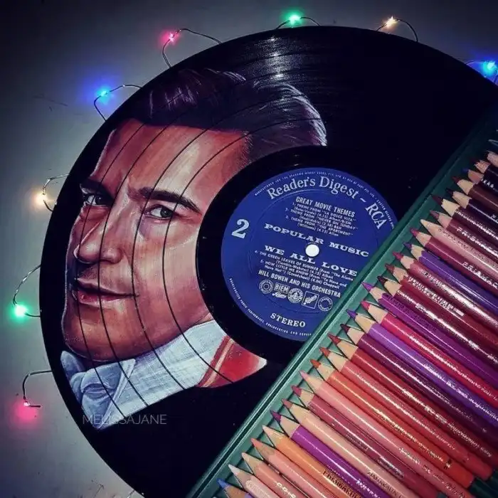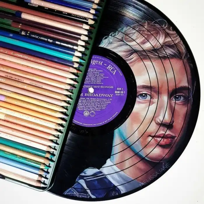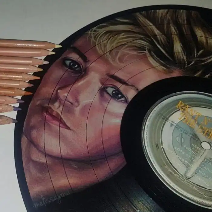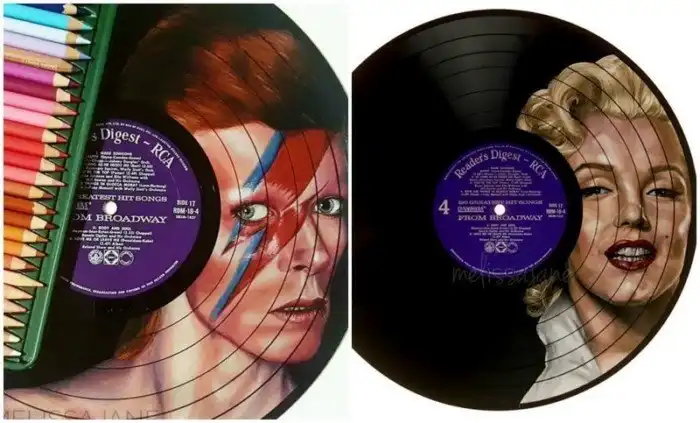 Австралийка Мелисса Джейн (Melissa Jane) всегда любила рисовать портреты, и уже 7 лет она рисует портреты известных людей на старых виниловых пластинках. Изначально девушка прикупила пару пластинок в секонд-хенде, попробовав набросать рисунки - и у нее получилось. С тех пор у Мелиссы собралась приличная коллекция винтажных пластинок с портретами музыкантов и актеров. Вот так рождается творчество!