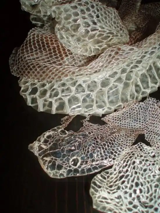 На самом деле, это выползок змеи без чешуи. По сути, это сброшенная кожа королевского питона Super Scaleless Head. У этой змеи вообще нет чешуи.