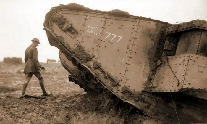 Король Бельгии Альберт в ходе визита на фронт рассматривает подбитый под Аррасом британский танк Mk.II с номером 777 и собственным именем "Чарли Чаплин". Май 1917 года.