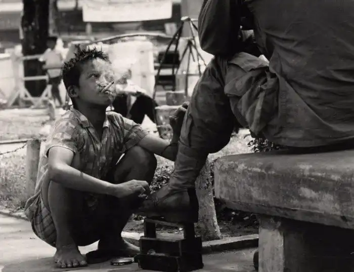 Вьетнамский мальчик чистит ботинки американскому солдату. Вьетнам, Сайгон. 1968 год.