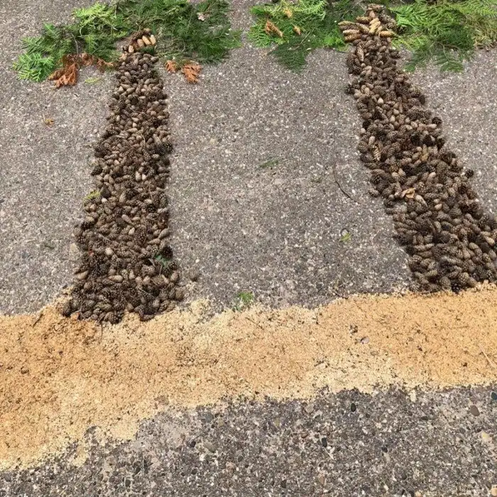 Иногда в расход идут природные материалы, оказавшиеся под ногами и получается "шишкография"