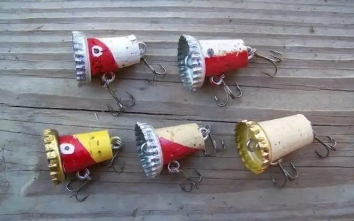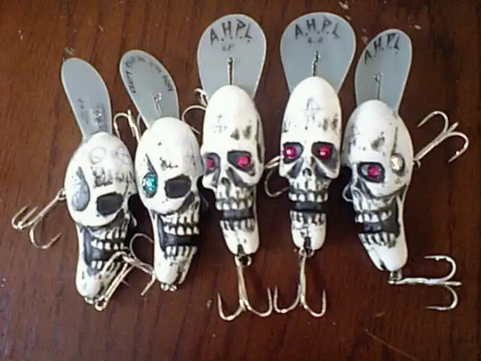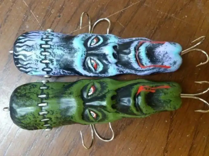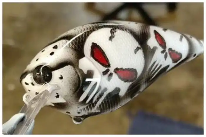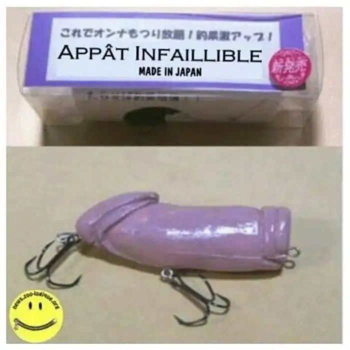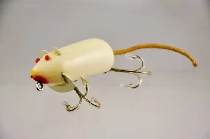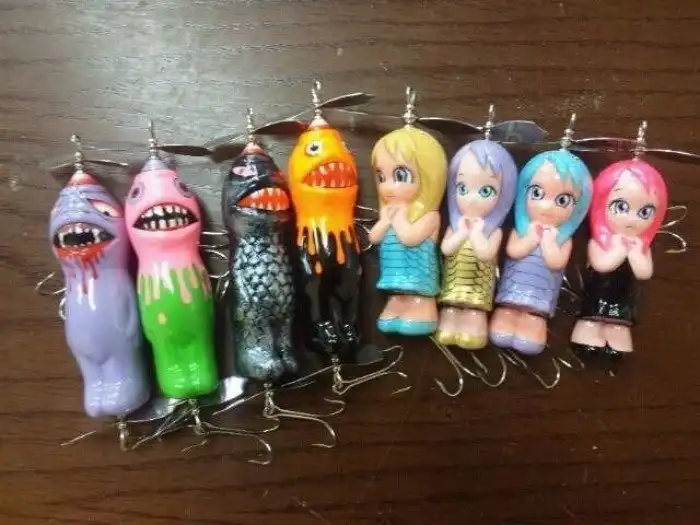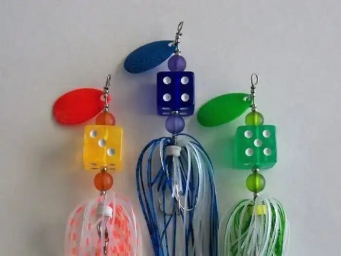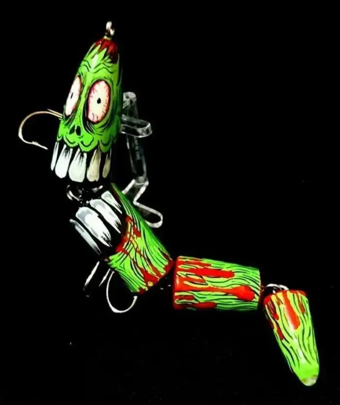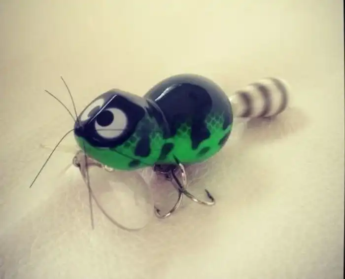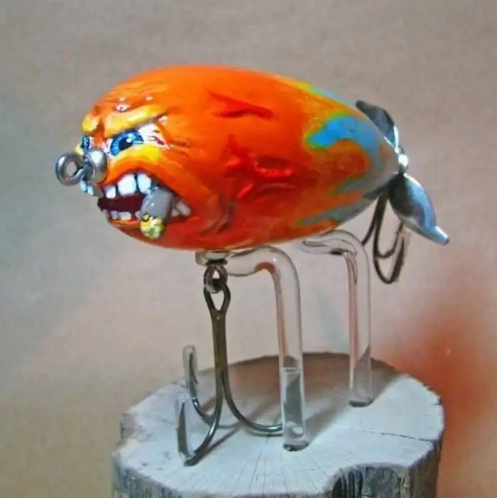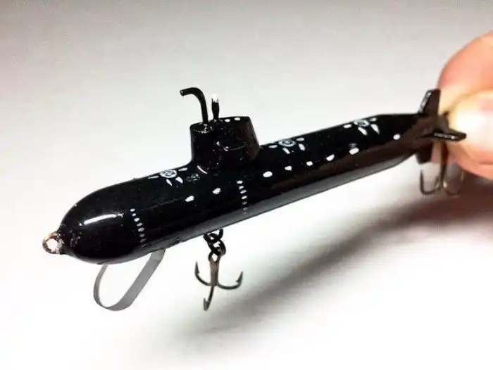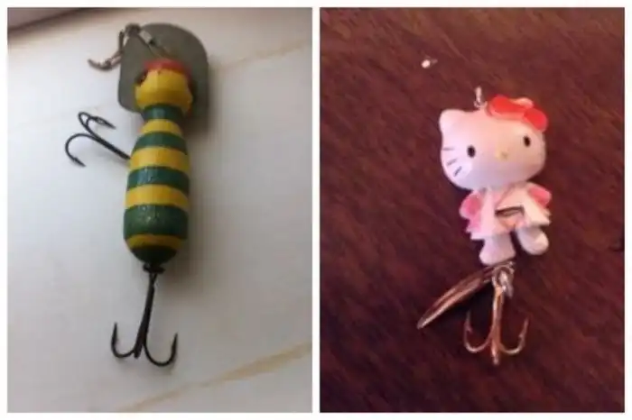 В хвосте и голове приманки находятся впаянные жалом вверх одинарные крючки, также имеются две петельки для крепления лески, и для дополнительного тройника и стабилизатор в её хвостовой части.