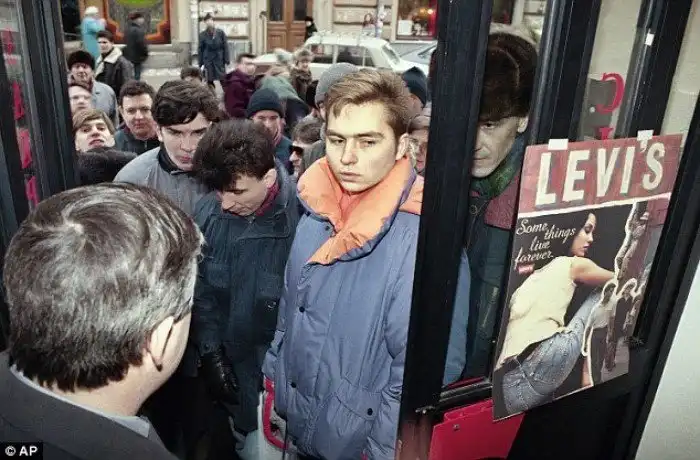 Сотни молодых людей ждут, когда откроет свои двери магазин Levi Strauss and Co, февраль 1993 года.