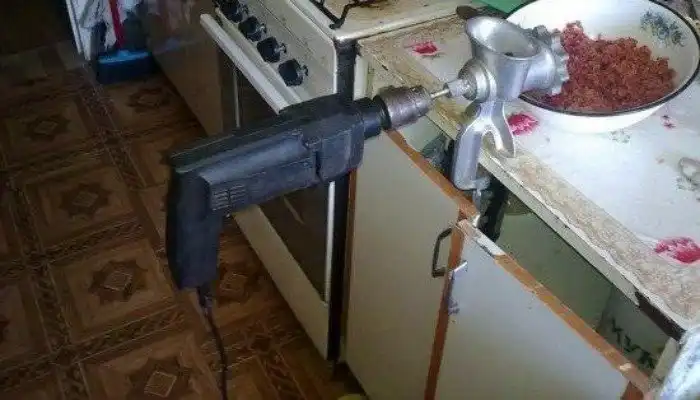 Есть еще и лайфхак, как модернизировать ручную мясорубку. Находчивые люди предлагают синхронизировать конструкцию с шуруповертом или электродрелью. Такой по производительности не уступает электрической мясорубке.
