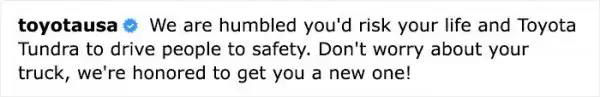 "Мы польщены тем, что вы рисковали своей жизнью и автомобилем Toyota Tundra, чтобы спасать людей и доставлять их в безопасное место. Не переживайте по поводу своего внедорожника, ведь мы с удовольствием подарим вам новый!"