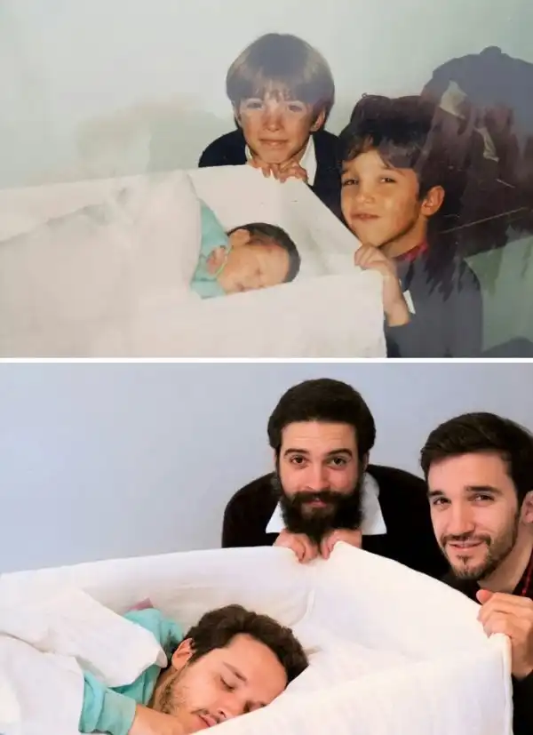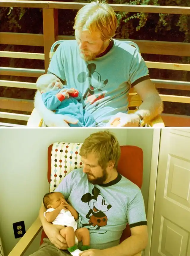 Подобные фотографии всегда вызывают теплые чувства, ведь их главные герои воссоздают свои старые снимки спустя много лет. Давайте посмотрим на то, как с годами меняются люди, но это вовсе не влияет на их отношения с близкими.