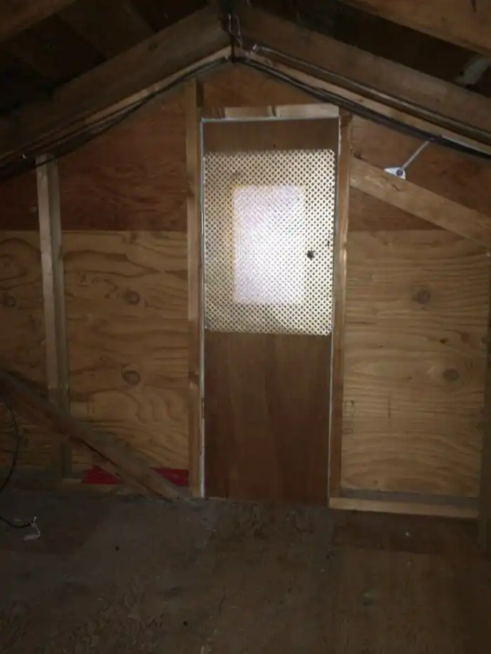 Маленькая дверь ( 1,2 м в высоту, 0,45 м в ширину) и металлическая сетка на окошке