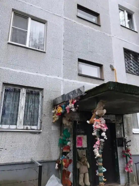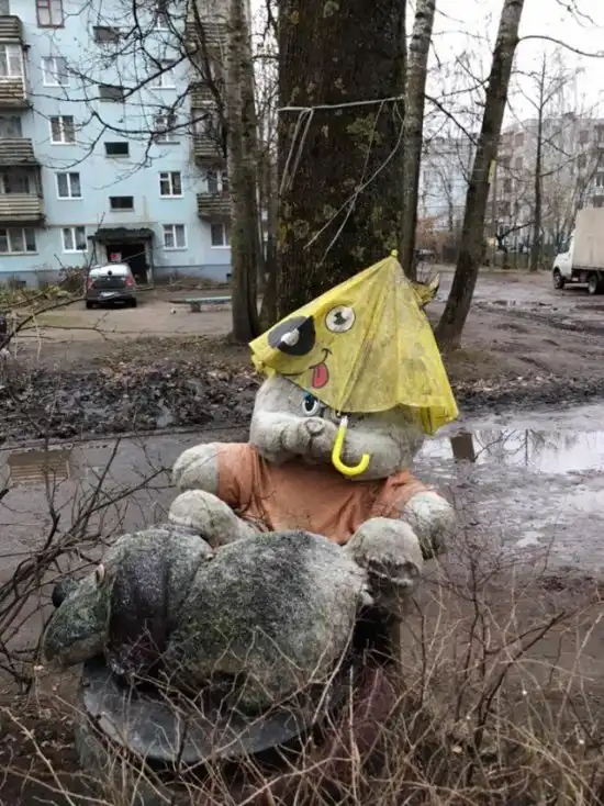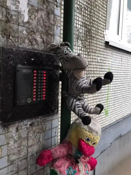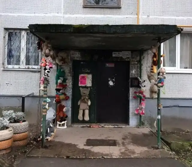 Хоть кто-то считает, что такой способ украсить двор является вполне адекватным, в действительности смотрится все это весьма жутко. Как говорится, зачем красить обшарпанные стены, делать ремонт входной группы, когда можно просто развесить старые мягкие игрушки на входе - и готово.