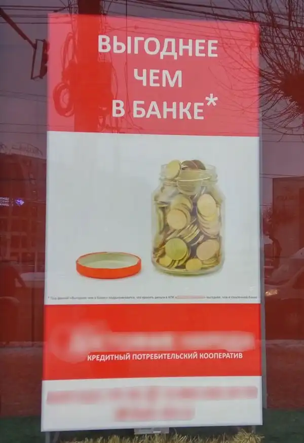 Автор это поста пишет, что заметил вот такой плакат в витрине одного из зданий, поэтому даже решил подойти и прочитать. Когда видишь такое, сразу хочется узнать, какие же там условия, что это "выгоднее чем в банке". Подходим поближе, но только присмотревшись, всё становится ясно.