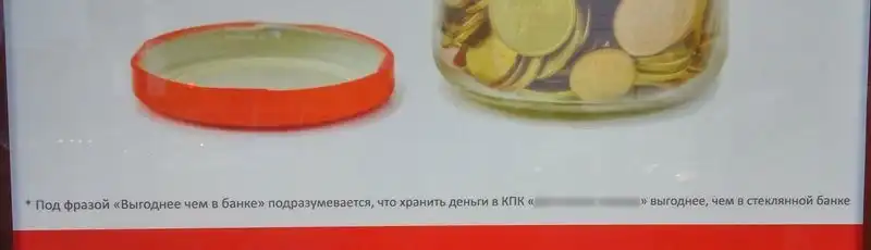 Смущает лишь чёрная полоска на белом фоне, которая на самом деле является полоской текста. А там так и написано: "Под фразой "Выгоднее чем в банке" подразумевается, что хранить деньги в *** выгоднее, чем в стеклянной банке".