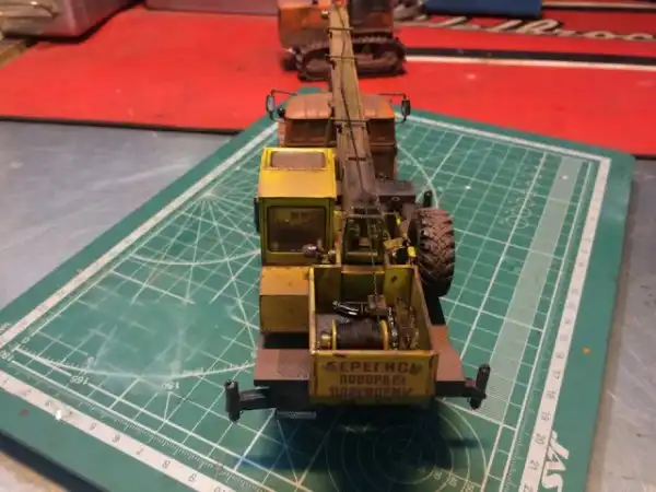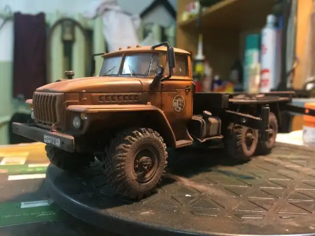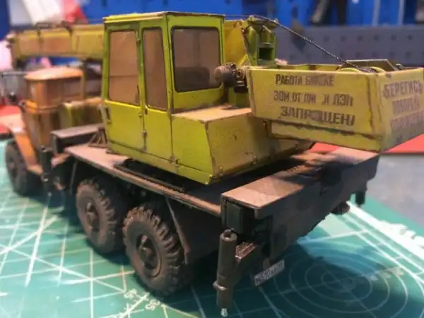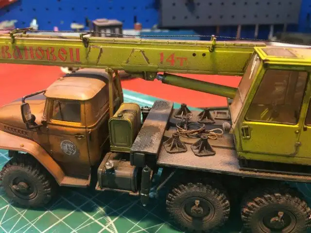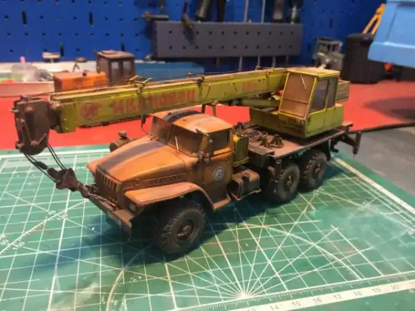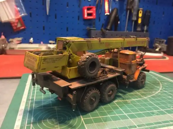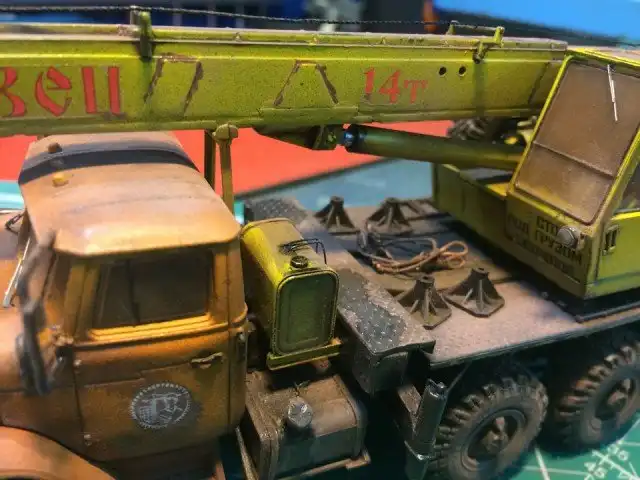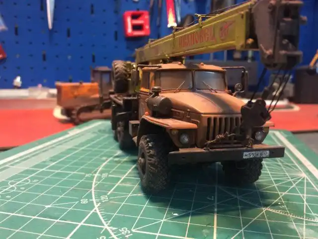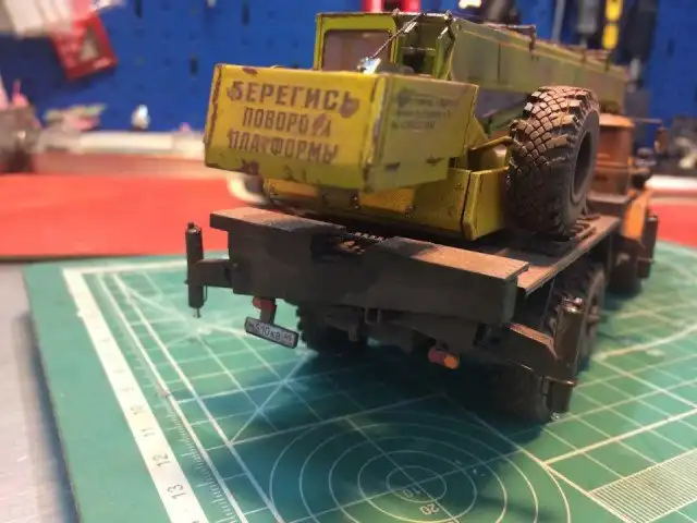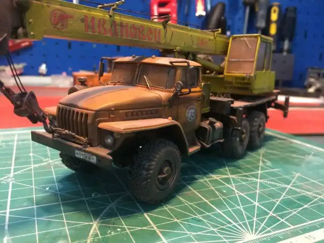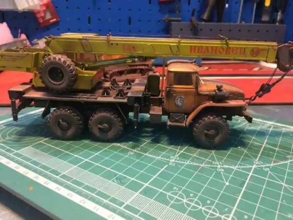 В сборочном цеху новая спецтехника, кран Ивановец на базе Урала. На этот раз модель будет "не с завода", а видавший работу трудяга. Собрал пока только шасси и платформу крановой установки, машина чуть состарена, в пыли и грязи, добавлены трубки гидросистемы на опорах, ленты из фототравления на топливный бак и гидробак.