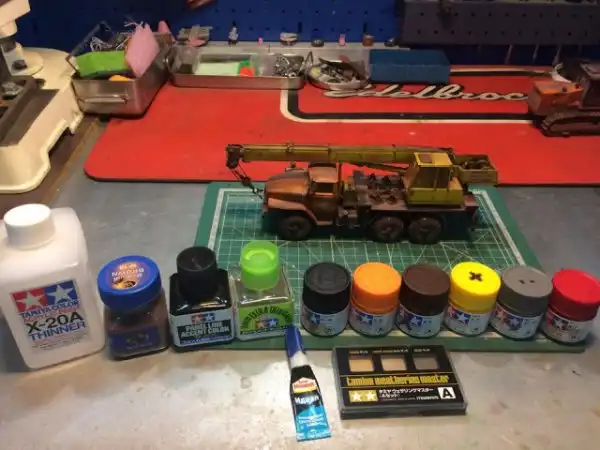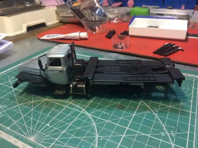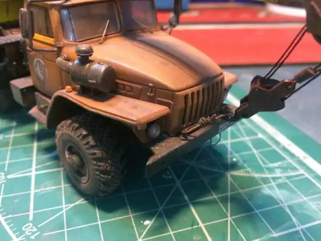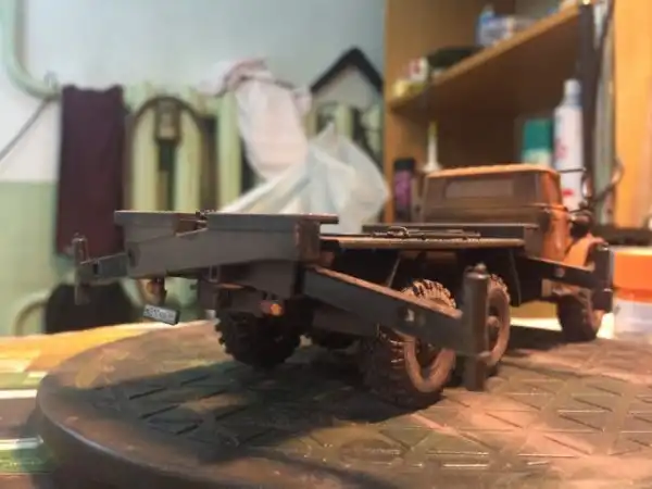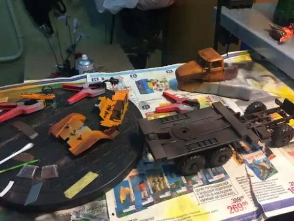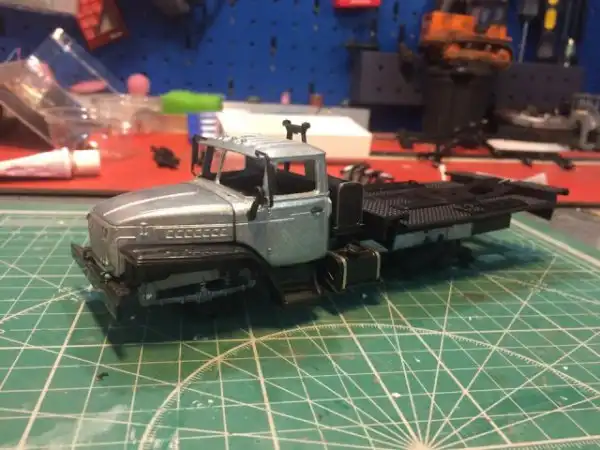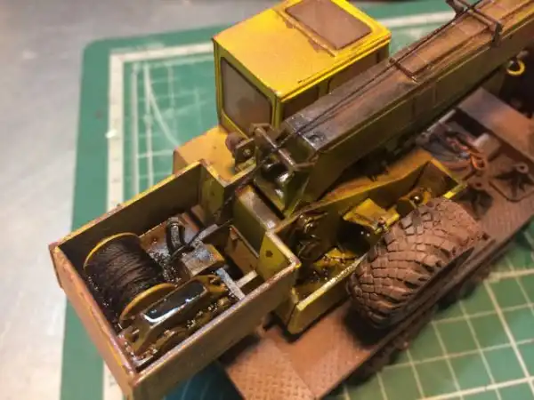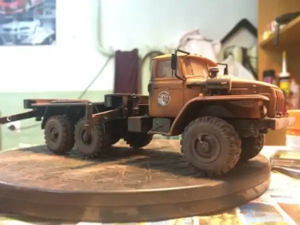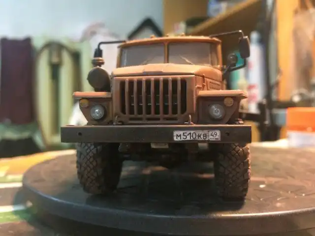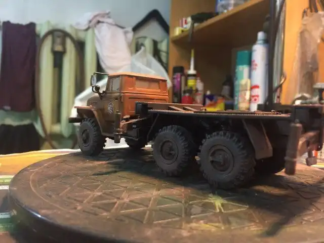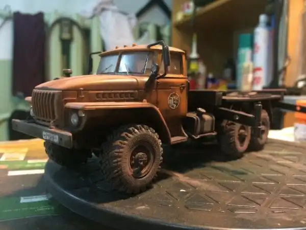 В сборочном цеху новая спецтехника, кран Ивановец на базе Урала. На этот раз модель будет "не с завода", а видавший работу трудяга. Собрал пока только шасси и платформу крановой установки, машина чуть состарена, в пыли и грязи, добавлены трубки гидросистемы на опорах, ленты из фототравления на топливный бак и гидробак.