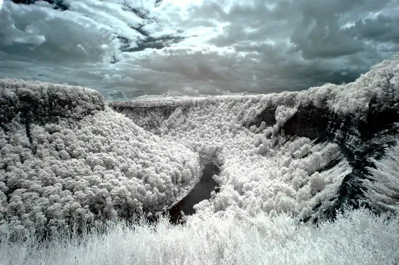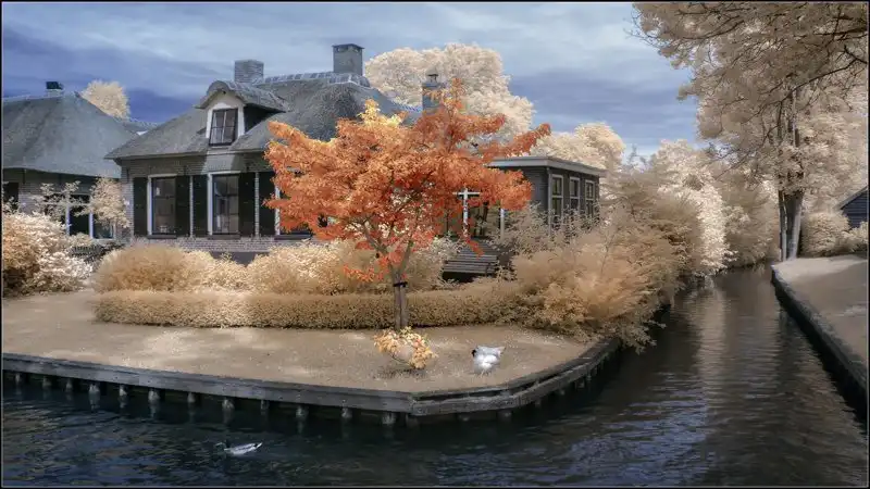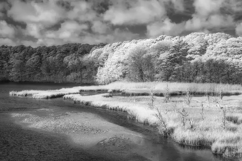 Вода и небо на таких фотографиях поглащают инфракрасное излучение, тогда как листва и облака его отражают. Именно по этой причине на инфракрасных фотографиях листва и облака предстают максимально светлыми, тогда как небо и вода получаются максимально черными.