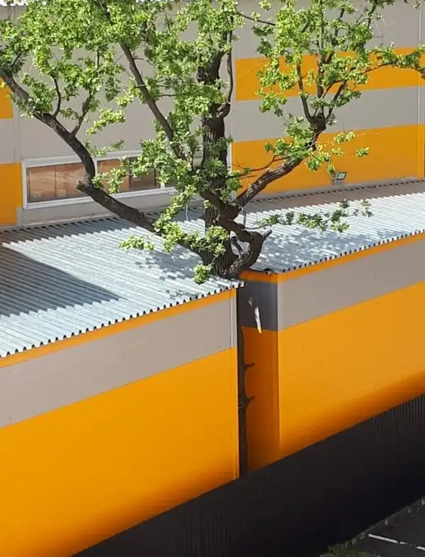 Вместо того чтобы спилить дерево, строители заботливо обогнули его, когда строили стену