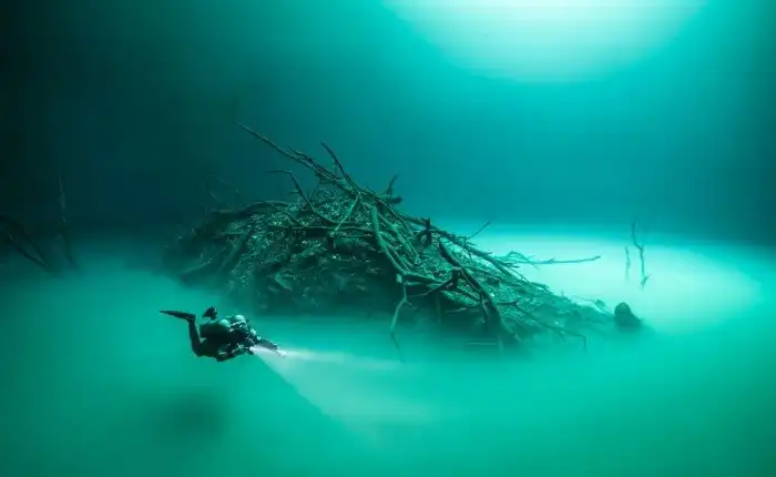 Особый состав воды в пещере создает полное ощущение подводной реки. Разница в плотности соленой и пресной воды позволяет водолазам почувствовать себя в мире фантастических пейзажей: пресная вода дрейфует в верхнем слое, а соленая в нижнем — так и получается «текущая река».