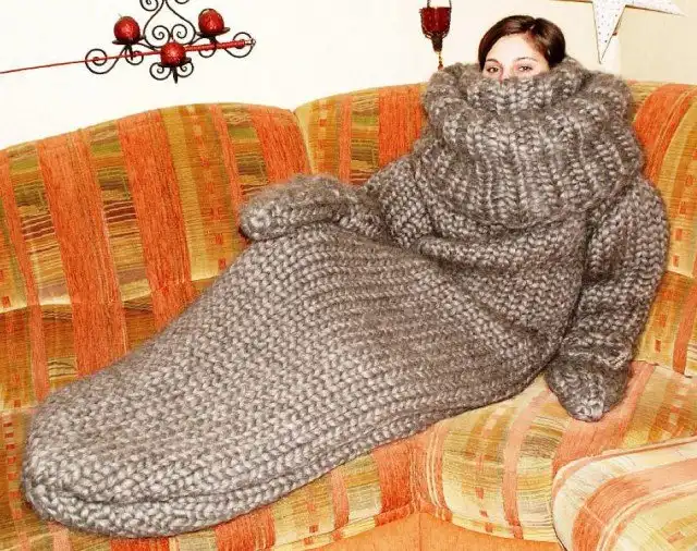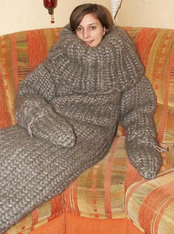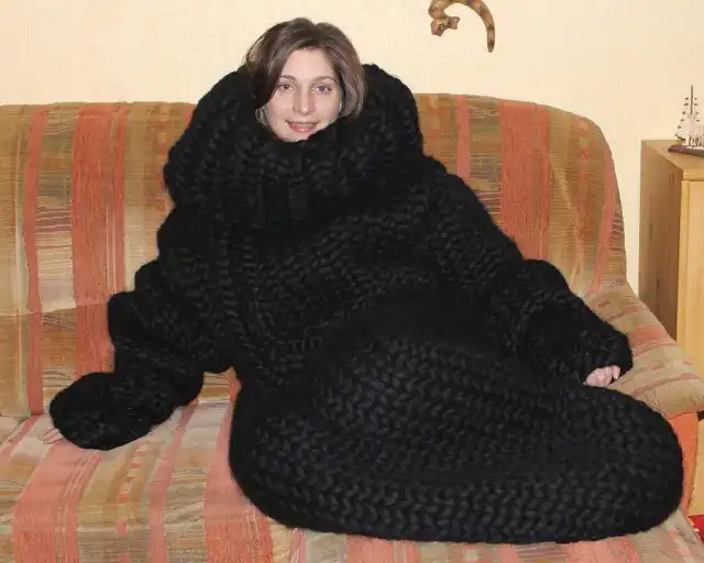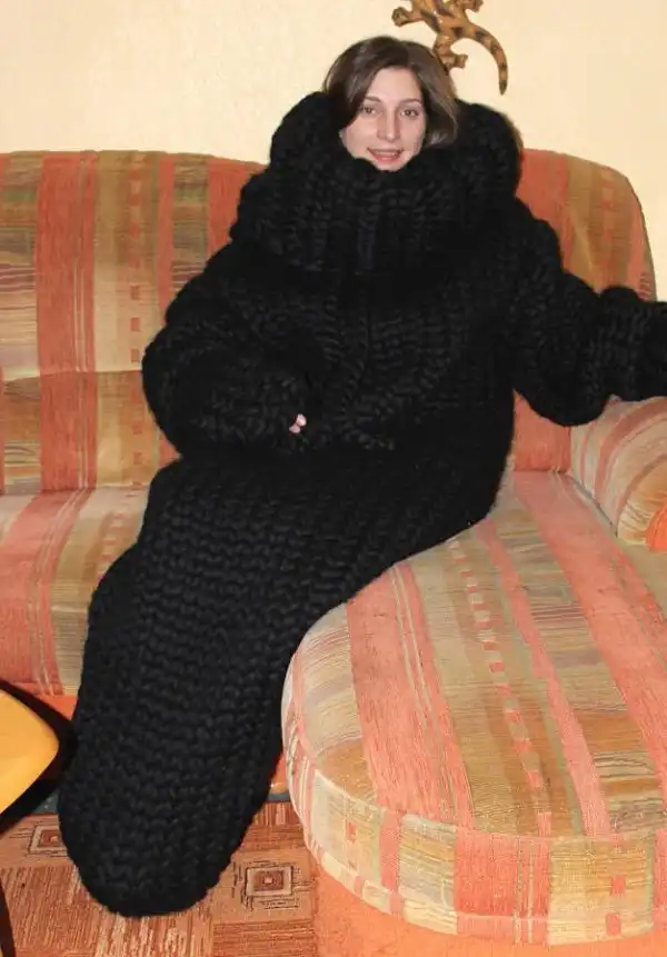 Зайдем на сайт рукодельников etsy.com и поищем что нибудь теплое и вязаное. Так, похоже это наш вариант. За 550 долларов (870 в радикально черном цвете) можно стать обладателем вот такого ... кокона. Что скажете? Не продует?