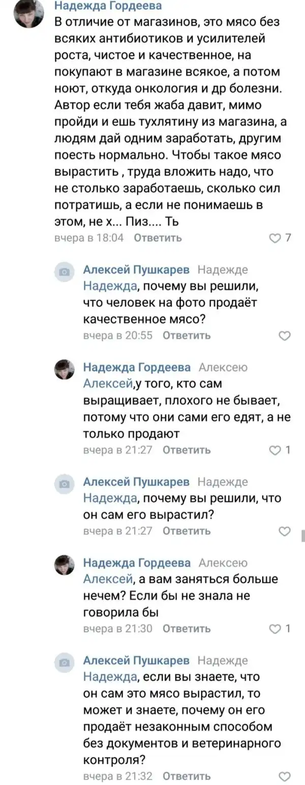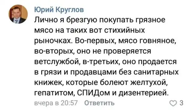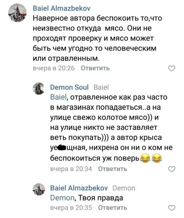 Вчера в социальной сети появился пост от пользователя, который опубликовал несколько фотографий мини-рынка, где открыто продавалось мясо без документов. Но такая публикация вызвала абсолютно противоположную реакцию у пользователей сети, которые стали на защиту продавцов, назвали автора фотографий крысой и пригрозили отыскать его, чтобы наказать. А что вы думаете по этому поводу?