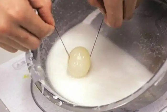 Первым делом изготавливается желток будущего яйца. Для этого умельцы используют химическое вещество, очень близкое по консистенции к оригиналу. Так как оно полностью бесцветно, то его окрашивают в желтый цвет химическими красителями. Окрашенный состав заливают в круглые формы для того, чтобы он принял шарообразную форму.