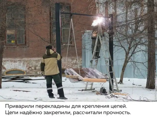 В то время, как многие жители городов лишь только жалуются на то, что чиновники ничего не делают для обустройства территорий и парков, житель Челябинска решил сделать городу подарок своими руками. По словам руководителя проекта Андрея Фролова, еще осенью они сделали две качели в мёртвом сквере, а затем получили множество радостных писем от местных жителей. Но теперь они решили изготовить новые качели, ведь желающих покататься оказалось гораздо больше, чем предполагалось.