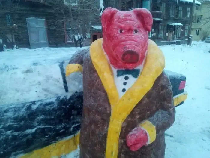 Этот могучий свин из окрашенного снега появился в Ленинском районе Новосибирска на улице Степной. свинобарин в богатой шубе стоит у авто. Прекрасным фоном для композиции являются деревянные бараки.