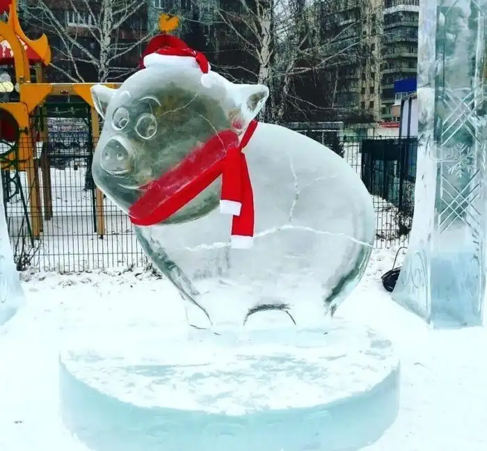 Милый ледяной свин в шапке и шарфе.