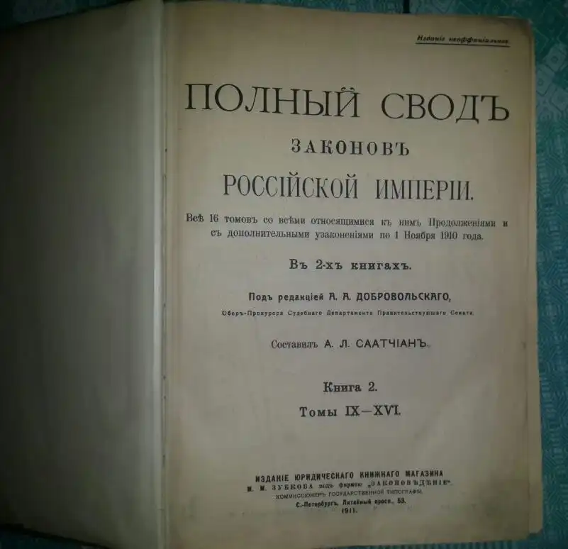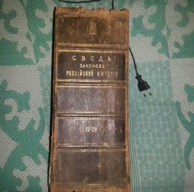 Автор этого поста пишет, что еще 15 лет назад купил гараж, но из-за постоянных командировок по работе, гараж стоял без дела все эти годы. Но теперь он решил разобрать старые коробки и хлам, который достался ему при покупке гаража от прошлого владельца. Самое первое, что попалось под руку и оказалось весьма интересным, это вот такой исторический "Свод законов Российской империи".