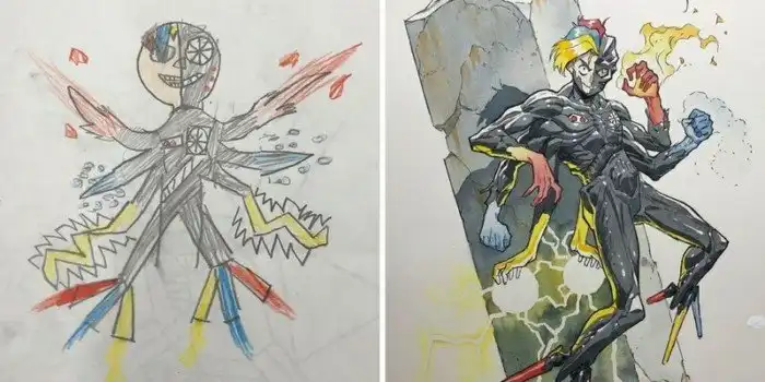 Мальчики рисуют разных странных существ (отец говорит, что не ограничивает полёт их фантазии), а сам художник выбирает некоторые наброски и превращает их в эпичных монстров. Чёрно-белые рисунки не принимаются — сыновья должны сами решить, каких цветов будет их герой. И вот результаты их совместного творчества: