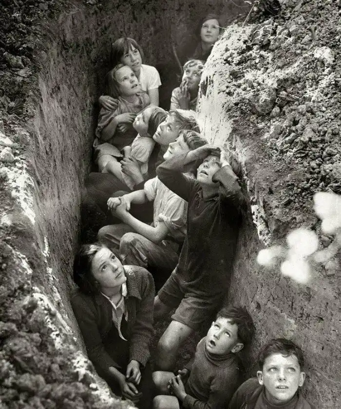 3. Дети в окопах бомбоубежища в Англии, примерно 1941 год