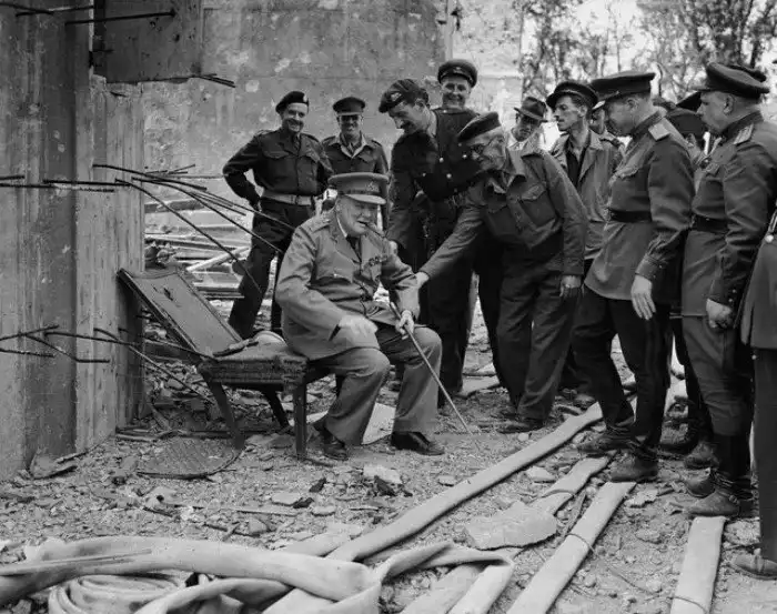 6. Уинстон Черчилль садится на то, что осталось от кресла Адольфа Гитлера в июле 1945 года