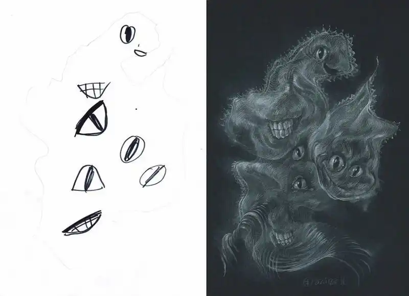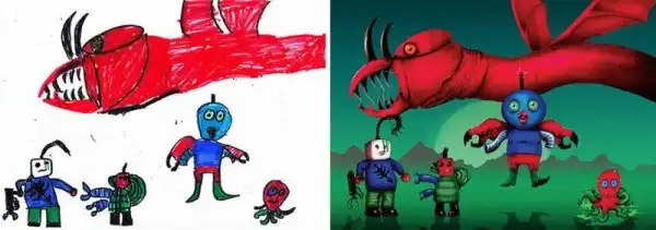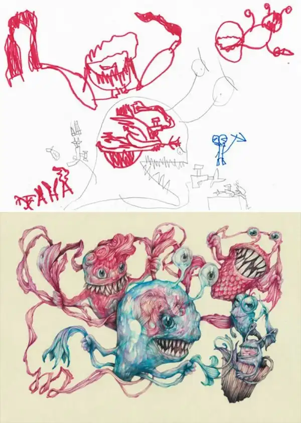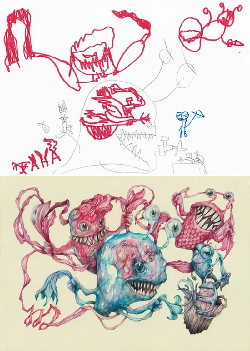 Всем известно, что дети обладают безудержным воображением, да и с творческой визуализацией они в ладах. Тем не менее, крайне важно вдохновлять ребенка не просто копировать идеи из мультфильмов и игр, а использовать воображение, следовать своему творческому потенциалу. Именно этим и занимается проект "The Monster Project" : школьники рисуют монстров, а профессиональные художники дорабатывают их эскизы. Подобным творчеством занимается талантливый иллюстратор Аарон Зенц.