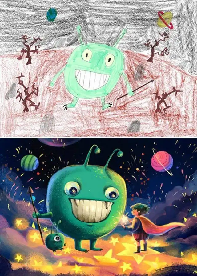 Хотите взглянуть на то, как преображаются детские рисунки, если за них берутся профессиональные иллюстраторы? Да, вы правильно поняли, художники перерисовывают рисунки детей, создавая настоящие шедевры из мира фантастики.