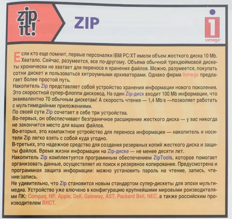 Если дискет не хватает (а их обычно все же хватало), то переносить данные можно было на магнитных носителях Iomega Zip. Пишущие CD-приводы уже существовали, но стоили дорого, их даже нет в московских прайс-листах.
