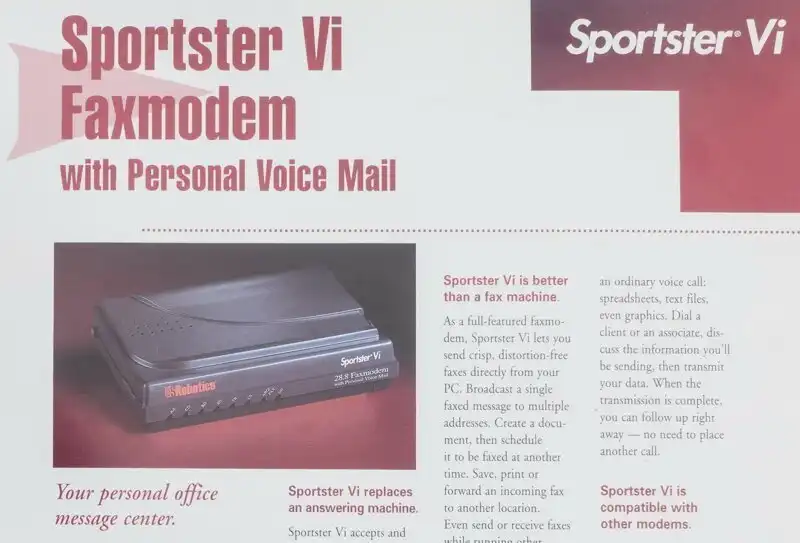 Реклама весьма популярного модема USR Sportster, в версии на 28.8 килобит в секунду. Дистрибутор раздавал англоязычную рекламу, приклеивая к каждой свою визитку.