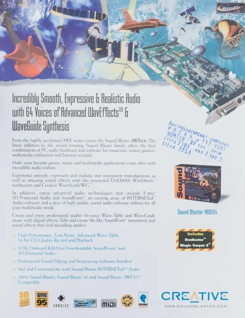 Прекрасная реклама звуковой карты Creative Sound Blaster AWE64, которой я до сих пор (в версии Gold) активно пользуюсь в своем винтажном компьютере. Сколько она стоила? Можно посмотреть в актуальном каталоге компании «Формоза-Центр».