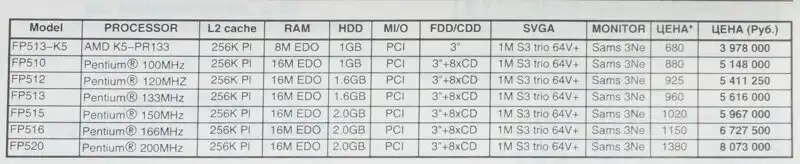 В этом материале приведены интересные сведения о новинках российских производителей компьютеров. Цитирую: "В домашние компьютеры устанавливается процессор Pentium с тактовой частотой 120/133/150/166/200 МГц или Pentium 166/200 MMX. В зависимости от конфигурации, они оснащаются 16-256 Мбайт EDO RAM, жесткими дисками от 2,6 до 4 Гбайт, видеокартой S3 Virge 3D/V+ с памятью от 2 до 8 Мбайт, 10- 12-скоростным CD-ROM и звуковой картой Creative Vibra 16". Газета «Коммерсант» такими подробностями не интересуется, и в ехидной манере пишет про проблемы с площадкой и «толпы жадных школьников». Интересна вот эта отмечаемая в разных источниках тенденция на консьюмеризацию рынка компьютеров: мне казалось, что это произошло гораздо позже. Впрочем, давайте посмотрим на музейные экспонаты.