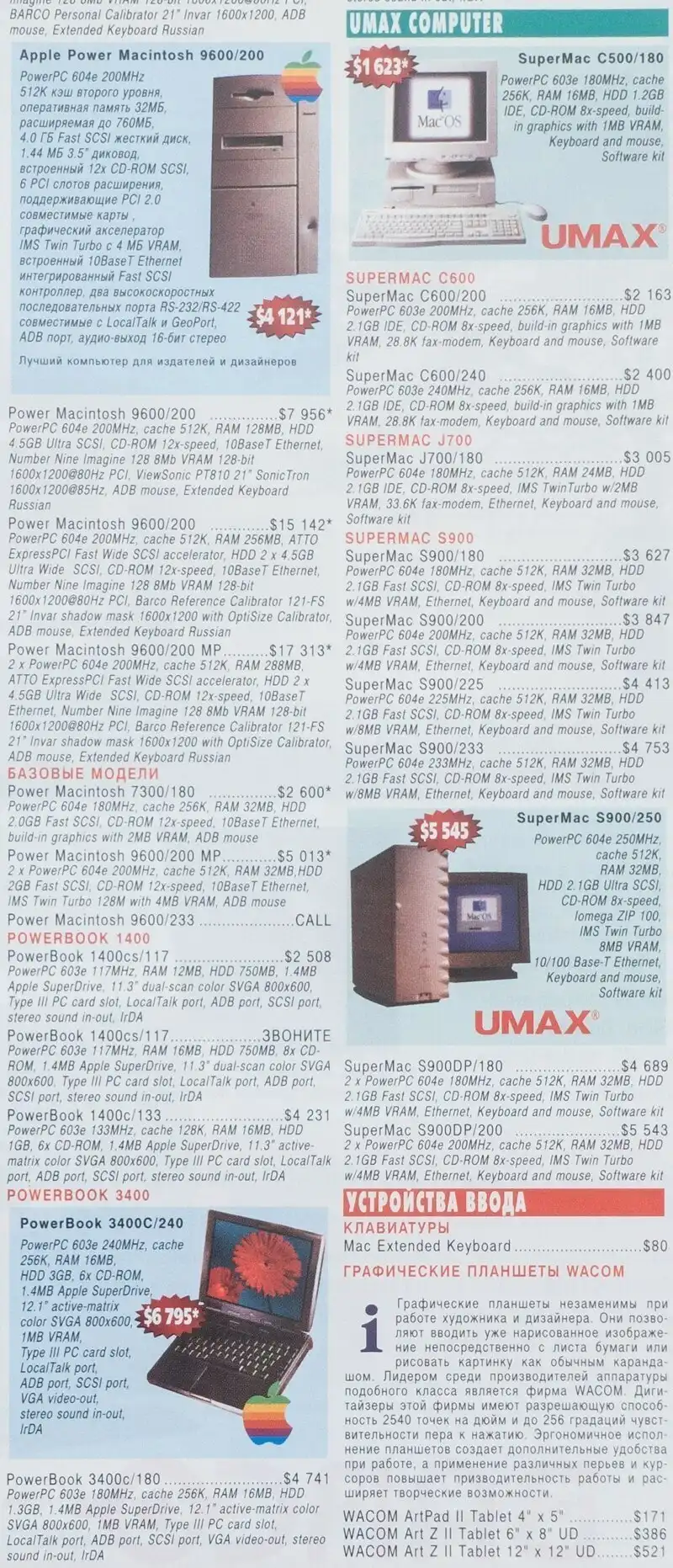 Прайс-лист техники Apple до возвращения Стива Джобса. Уникальная примета времени: продаются не только устройства самой Apple, но и официальные клоны. Практика лицензирования софта существовала какое-то время в попытке нарастить долю рынка, и была прекращена практически сразу после возвращения основателя Apple в свою компанию.