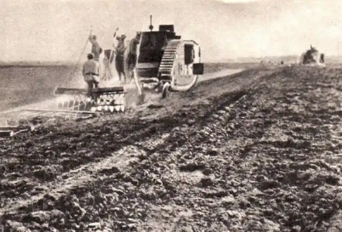 Захваченные у войск Антанты британские танки, используемые вместо тракторов в колхозе. СССР. 1920-е годы.