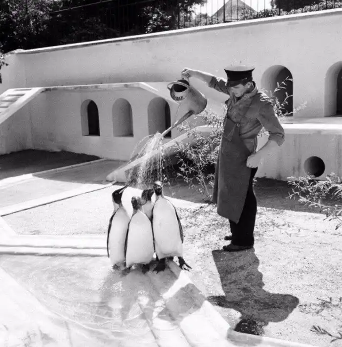 Смотритель зоопарка освежает пингвинов. 1930 год.