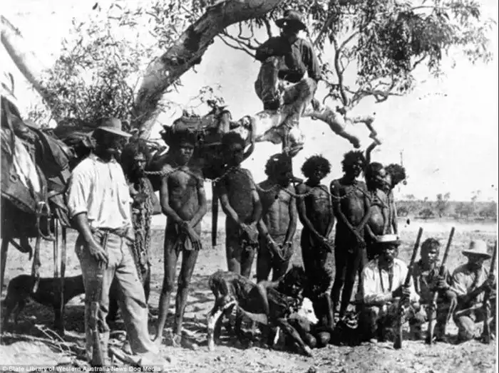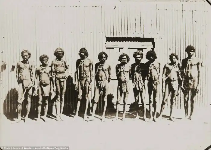 И эти черно-белые фотографии мужчин-аборигенов, выстроенных в очередь, скованных тяжелыми цепями и охраняемых белыми людьми, вооруженными винтовками, являются одним из многих свидетельств жестокого обращения с коренными австралийцами. Прибывшие в 1788 году колонисты изгнали аборигенов с их земель, что привело к гибели части культур и расслоению в обществе. Англичане завезли болезни, против которых у местного населения не было иммунитета. Эпидемии и алкоголь окончательно добили их.