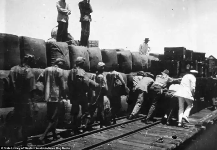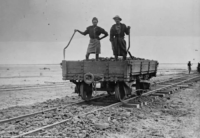 Коллекция ретро-фотографий показывает заключенных-аборигенов по всей стране, работающих на причальных железнодорожных линиях и прикованных к железнодорожным вагонам.