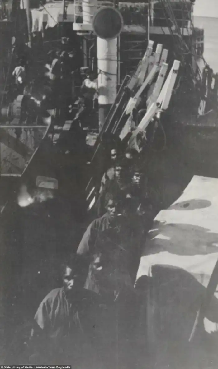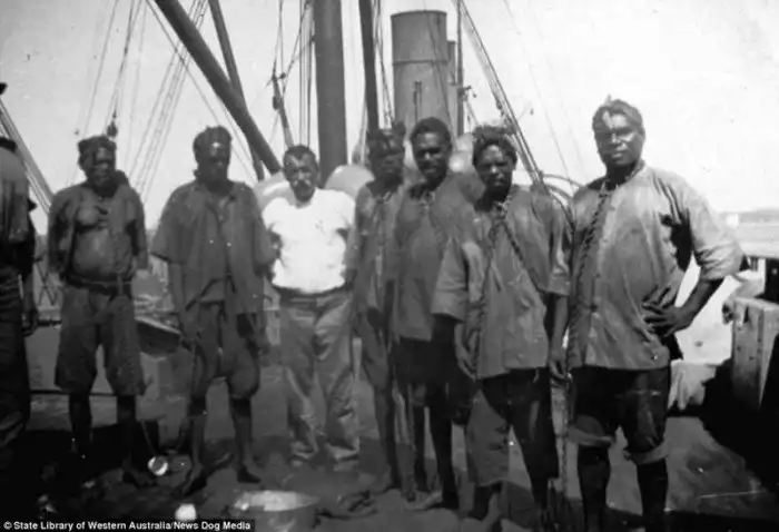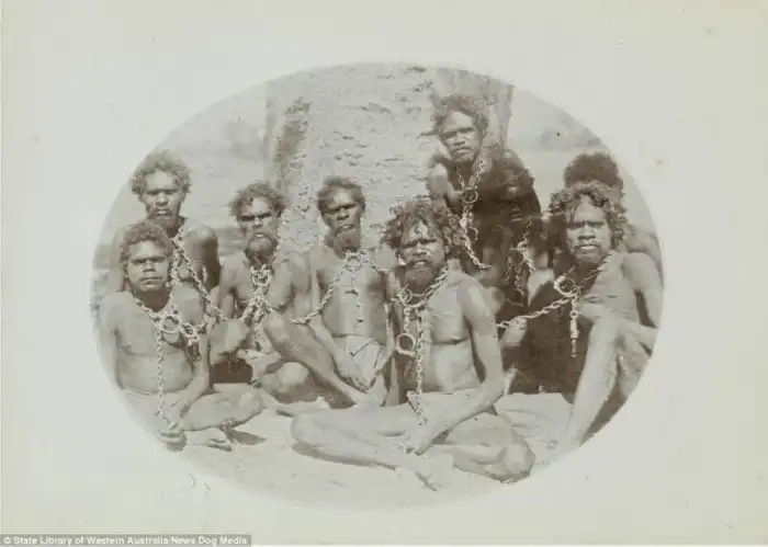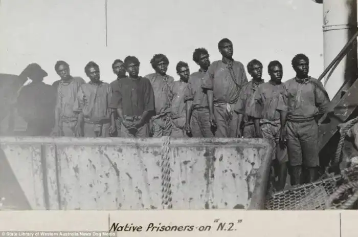 Одна из фотографий с надписью «Местные заключенные на N2», которая, предположительно, сделана на корабле, показывает 12 аборигенов, одетых в лохмотья, с цепями на шеях.