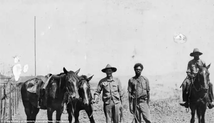 Около 1910 года были сфотографированы двое белых мужчин, которые вели одного заключенного из числа коренного населения.